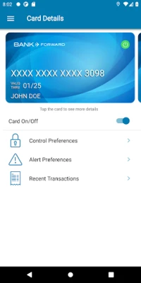 Bank Forward Card Control protects your debit cards by sending transaction alerts and enabling you to define when, where and how your cards are used. Download the app to your smartphone, then set your preferences and usage settings to monitor and manage your cards.