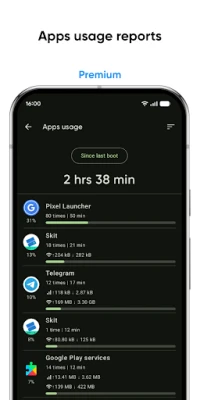 • Apps usage reports to determine the amount of time spent in each app and the amount of data it consumes;