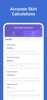 • Calculates Waist Radius, Total Fabric Length, Fabric Diameter, and Fabric Yardage
