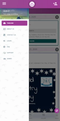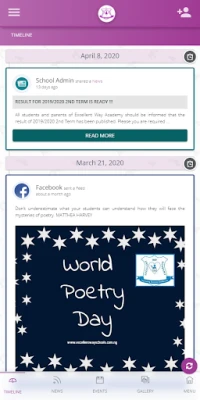 Timeline : This is a view that contains the summary of the online school activities such as News, Events, Facebook Feeds and Gallery.