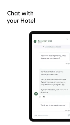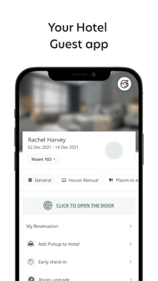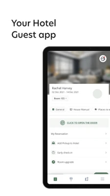 The Guest App allows you to open your hotel room door and access your room with a click of a button. Using the app you can view all of your reservation details, chat with the hotel and gain easy access to hotel services. You will also be able to discover additional activities in the hotel area, book transportation, and invite additional guests to the app. The Guest-App will auto-translate all hotel communication to your native language.