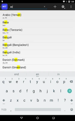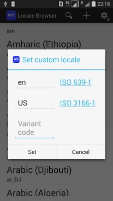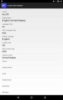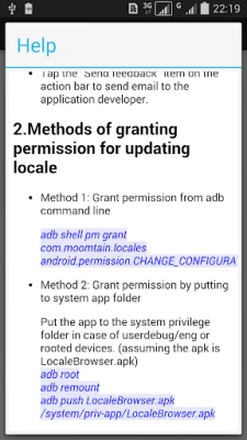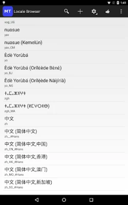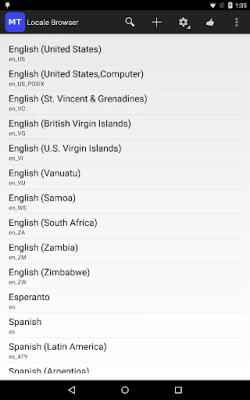 Main features. 1.List all available locales, including those not on the Settings->Language & Input->Language screen. 2.Display the locale list in different display languages. 3.Search locale. 4.Locale detail information. 5.Set an available locale as system locale. (Need android.permission.CHANGE_CONFIGURATION on Android 4.2 and later devices) 6.Set a custom locale as system locale.