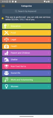 The RefAid app is for vulnerable people including displaced, migrants and refugees, people impacted by war and disasters and for volunteers and organizations that help them. It shows the location of and types of aid available on a map, with information about the opening days and hours. All of the aid shown in the app is from trusted official aid organizations. The aid is categorized by type including: Disaster and War; Health; Food; Shelter; Water; Non-food items; Legal/Admin/Info; particular aid for Parents and Children, Unaccompanied Children, Women and Men; Health; Education; and Toilets and Showers.