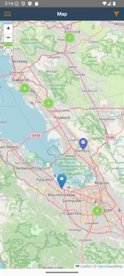 - A map view of aid nearby, shown by category of aid, using color coded icons