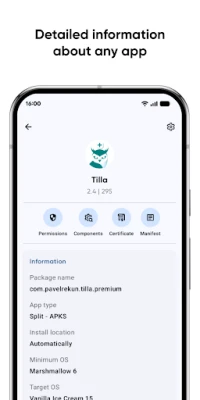 Find out how any selected app works from the inside. The list of activities, manifest, providers, broadcast events, services, used permissions, and even the details of the app's signature certificate are in your hands.