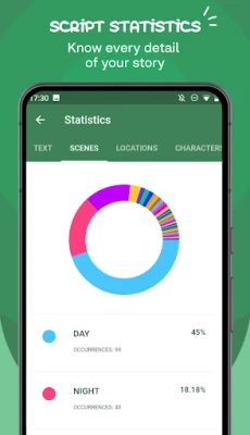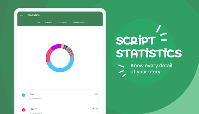 The app includes detailed character profiles where you can record biographies, relationships, and add visual references. This helps organize work on character arcs and track their development.